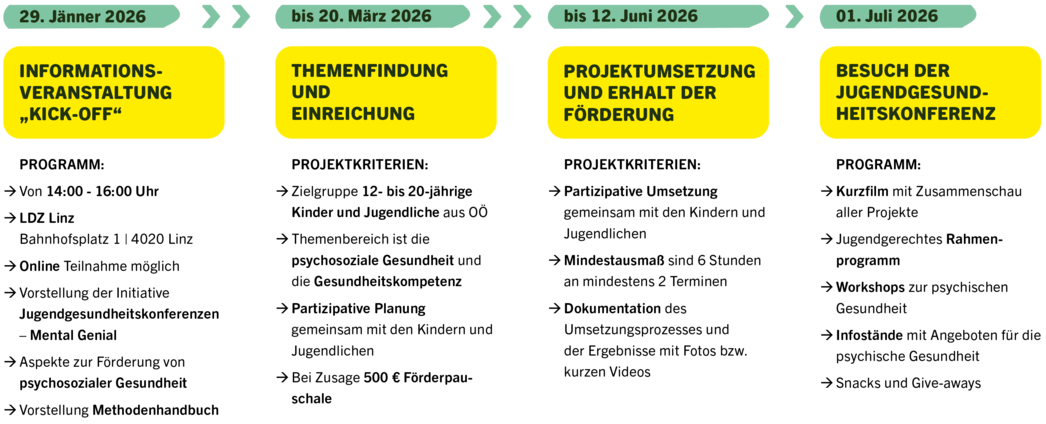 Die Jugendgesundheitskonferenz 2026 bietet jungen Menschen zwischen 12 und 20 Jahren aus den Bezirken Linz, Linz-Land, Rohrbach, Urfahr-Umgebung, Freistadt und Perg eine einzigartige Möglichkeit ihre Anliegen zur mentalen Gesundheit einzubringen. Mit Unterstützung von Lehrkräften, Trainer*innen oder Jugend- bzw. Sozialarbeiter*innen stärken Jugendliche in partizipativen Projekten ihre Gesundheitskompetenz. Mehr Informationen zu den Aspekten der psychischen Gesundheit von Jugendlichen.