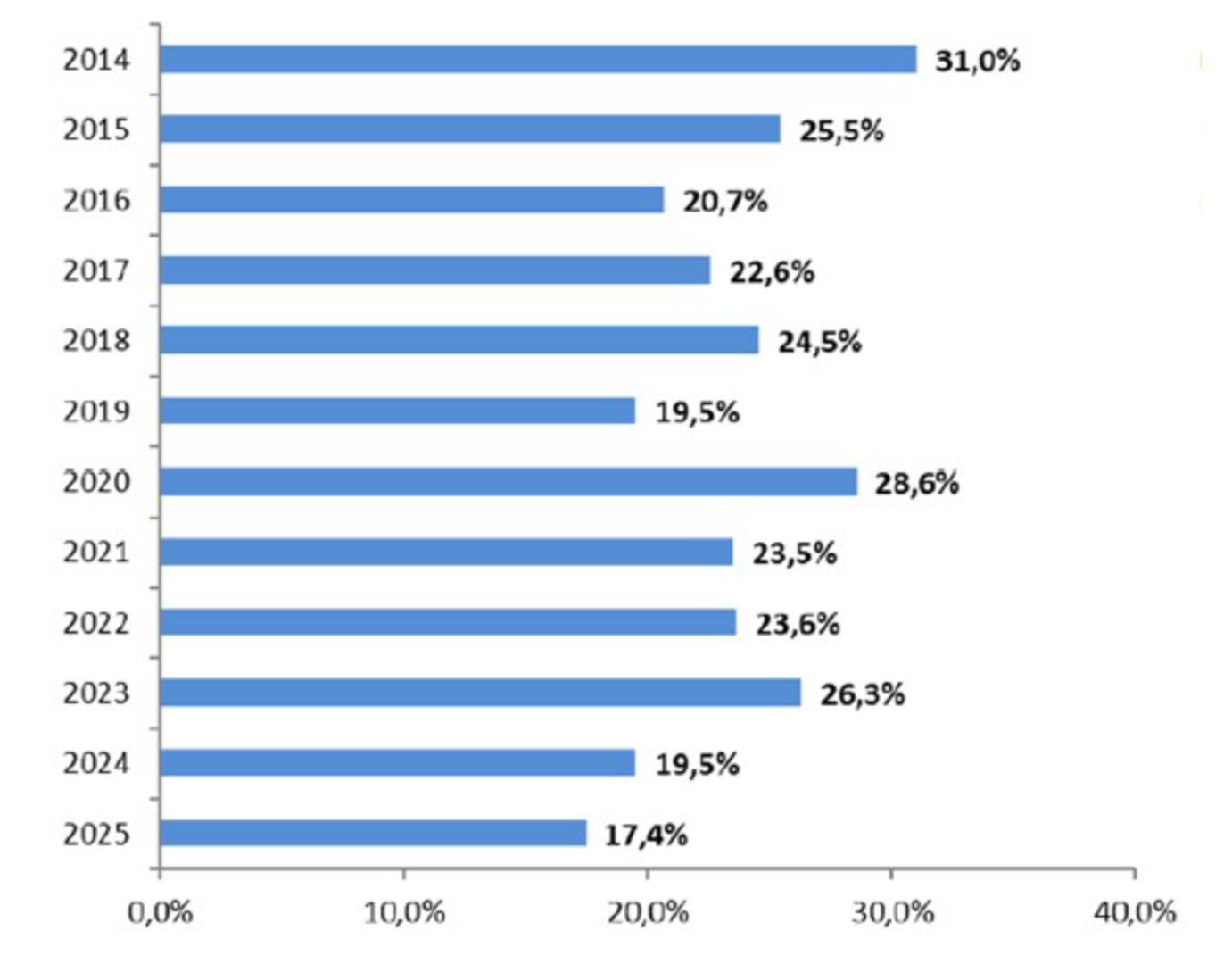 Die Abgabequoten in Tankstellenshops, in der Gastronomie und in Tabakfachgeschäften veränderten sich jeweils zum Positiven. Während in Tankstellenshops die Abgabequote um 9,8 % auf 13,7 % im Vergleich zum Vorjahr sank, gab es in der Gastronomie einen Rückgang um 4,9 % auf 15,2 %. Bei den getesteten Tabakfachgeschäften verbesserte sich die Abgabequote um 1 % auf 12,5 %. Sie wiesen auch 2025 von allen Branchen das beste Testergebnis aus. Langfristig lässt sich eine klare positive Entwicklung der Abgabequote seit der Einführung der Testkäufe feststellen.